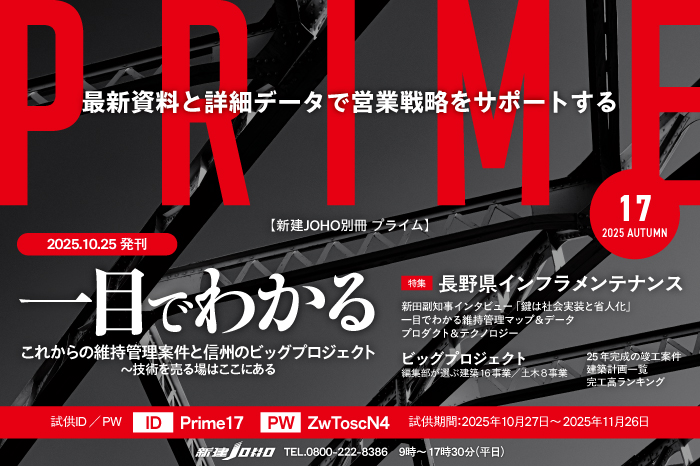 定期刊行物のPrime「Vol.17(autumn)」を10月25日に発刊しました。県内のハード事業を各分野に細分化し工事情報の詳細データをまとめ、皆さまの営業戦略に生かせる内容をお届けします。 今号は「一目でわかる これからの維持管理案件と信州のビッグプロジェクト~技術を売る場はここにある~」がテーマ。新田恭士副知事のインタビューや、県内の維持管理マップ&データ、編集部が選ぶ建築・土木の注目事業のほか、県内の建築計画一覧表や、県内企業の完工高ランキング、今年度に完成した竣工案件を収録しました。 本サイト契約者は、贈呈送付した当書1部のほか、トップページ下部の「オススメ」に添付した閲覧用PDFでもご覧いただけます。今後のビジネスの一助となれば幸いです。 本書に関する問い合わせは、電話0800-222-8386(フリーダイヤル)まで。