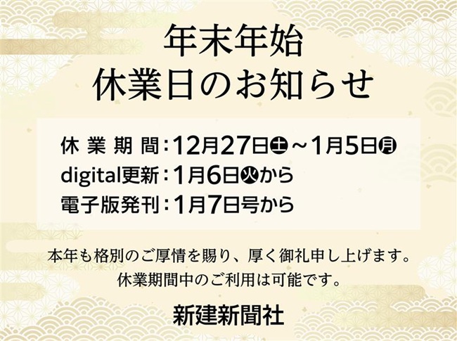 本年も格別のご厚情を賜り、厚く御礼申し上げます。 小社では年末年始の期間におきまして、2025年12月27日(土)~2026年1月5日(月)まで休業させていただきます。 期間中、建設業界向けデジタル情報サービス「新建JOHOdigital」は、ニュースや記事の閲覧など各種機能をご利用いただけますが、最新情報の更新は2026年1月6日(火)から再開いたします。 また、「新建JOHO電子版」(紙面をデジタルでお届けするサービス)の年初発刊は1月7日号からとなります。 お問い合わせ対応は2026年1月6日(火)以降となります。お客様にはご不便をおかけいたしますが、何卒ご容赦くださいますようお願い申し上げます。 本年一年のご愛顧に心より感謝申し上げますとともに、来年も変わらぬお引き立てのほど、よろしくお願い申し上げます。 サイト管理者